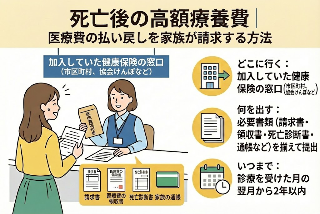 還付請求ができる期限は、「診療を受けた月の翌月の初日」から2年間です。葬儀後の慌ただしい時期を過ぎてからでも間に合いますが、領収書を紛失する前に早めに手続きしましょう。